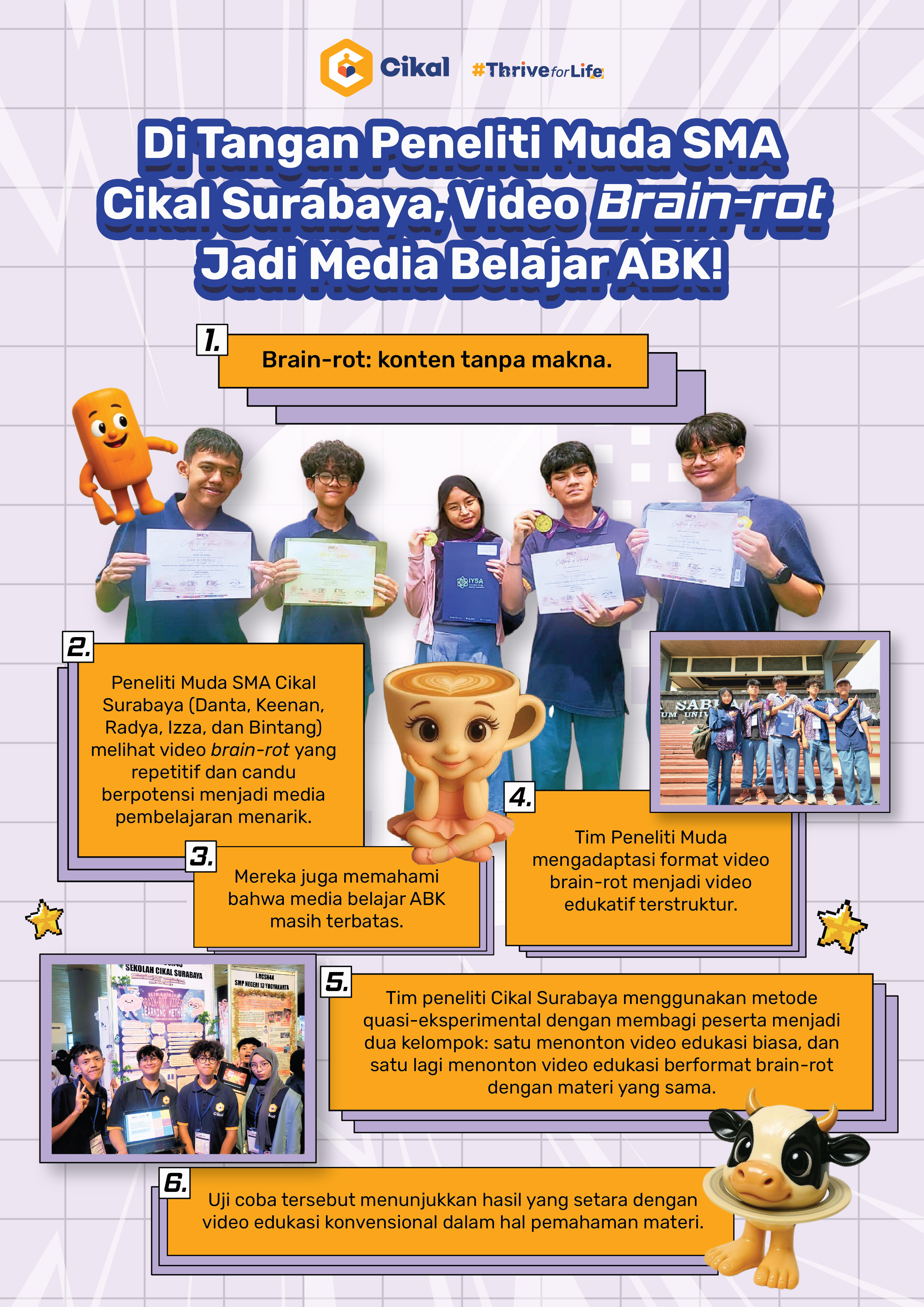 Kebanyakan orang mengetahui bahwa konten brain-rot adalah hiburan tanpa makna yang dapat menurunkan fokus pada siapapun yang menontonnya. Namun, tim peneliti SMA Cikal Surabaya memanfaatkan candu konten tersebut sebagai media pembelajaran anak berkebutuhan khusus.